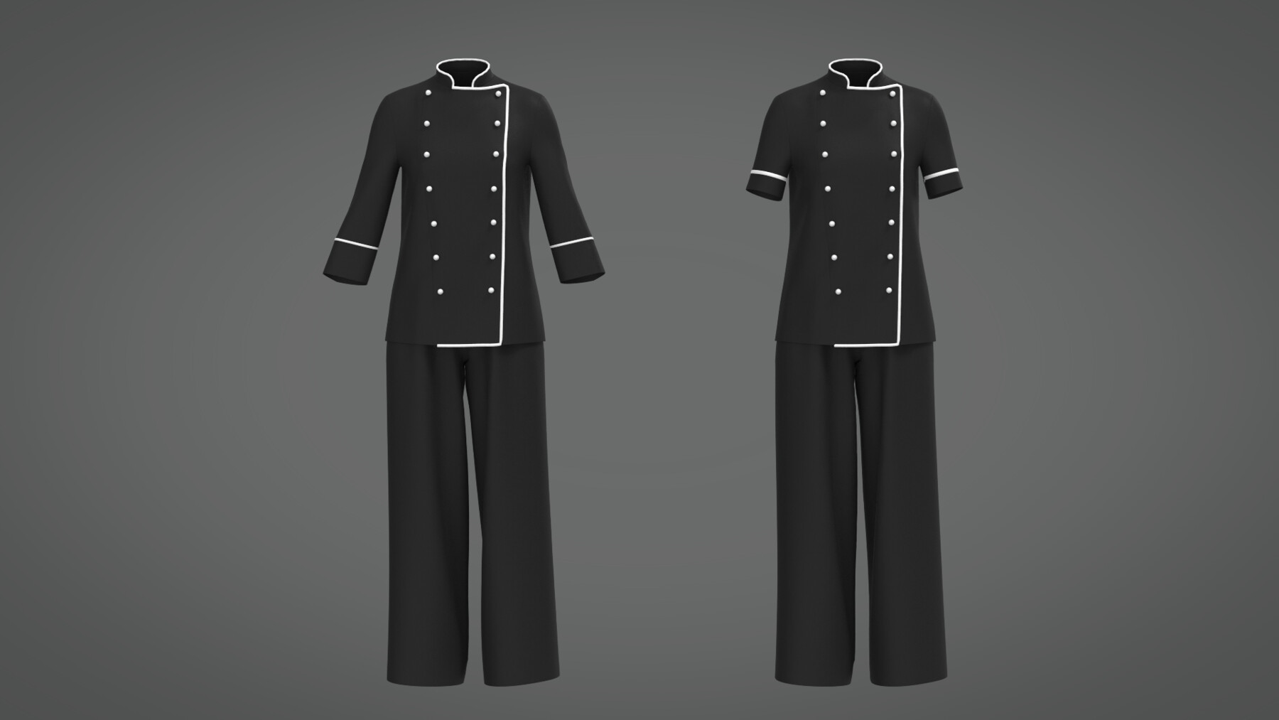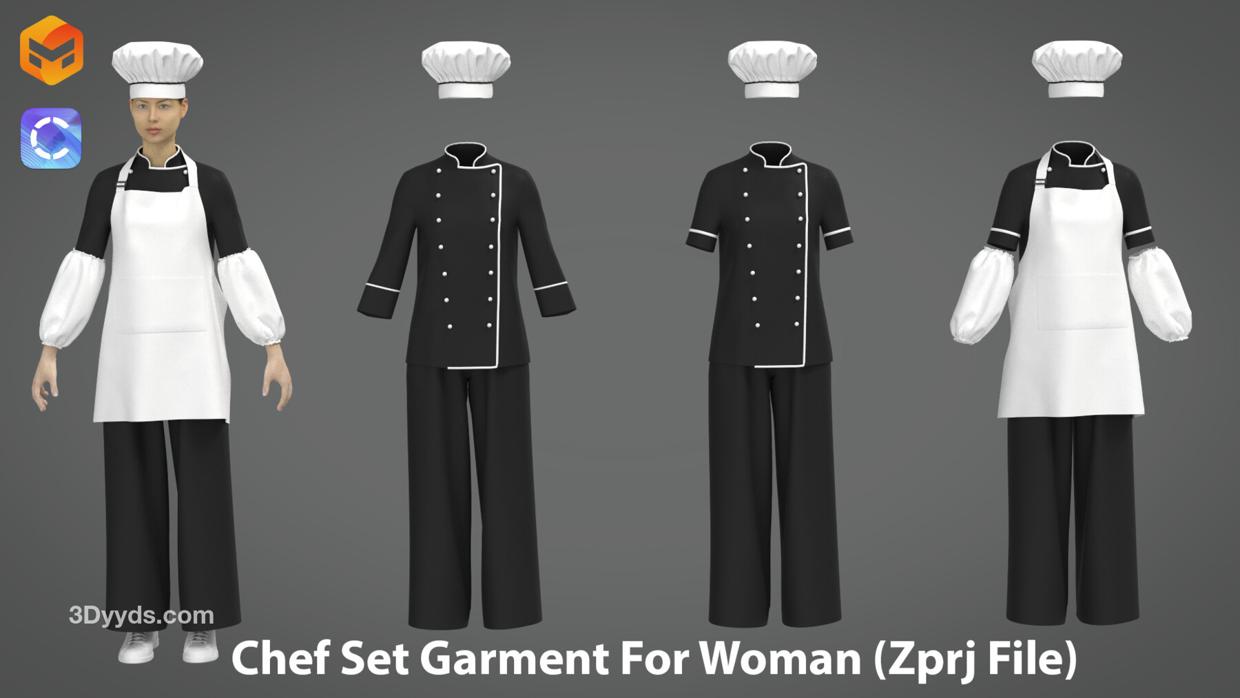 3d 女士厨师制服套装包括(夹克、短袖夹克、帽子、围裙、裤子、袖子)Zprj 文件。奇妙的设计师/ Clo3d 文件