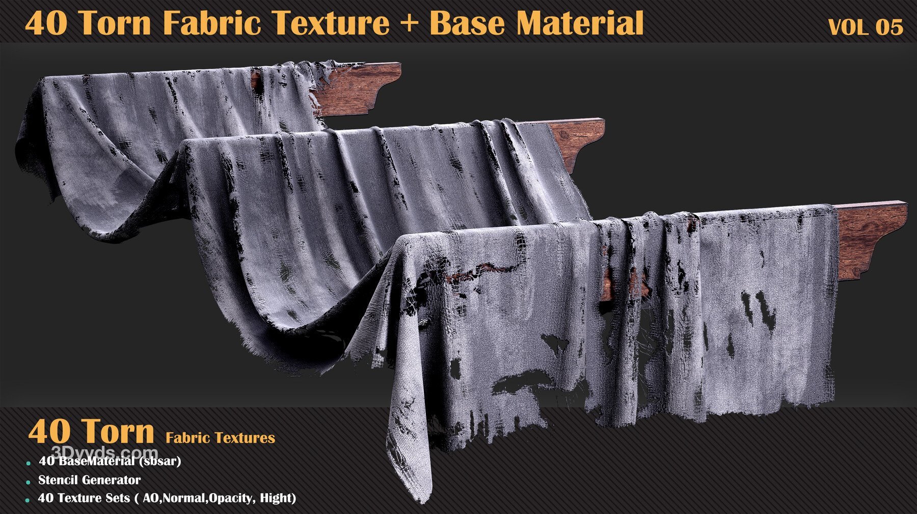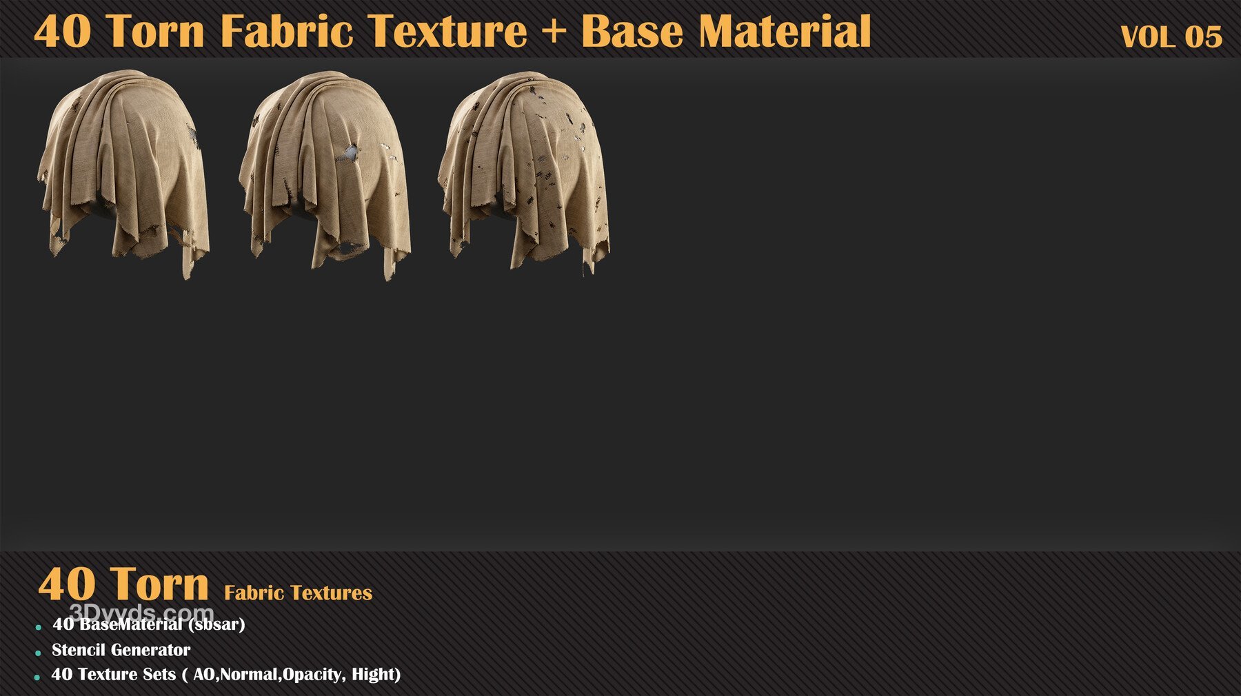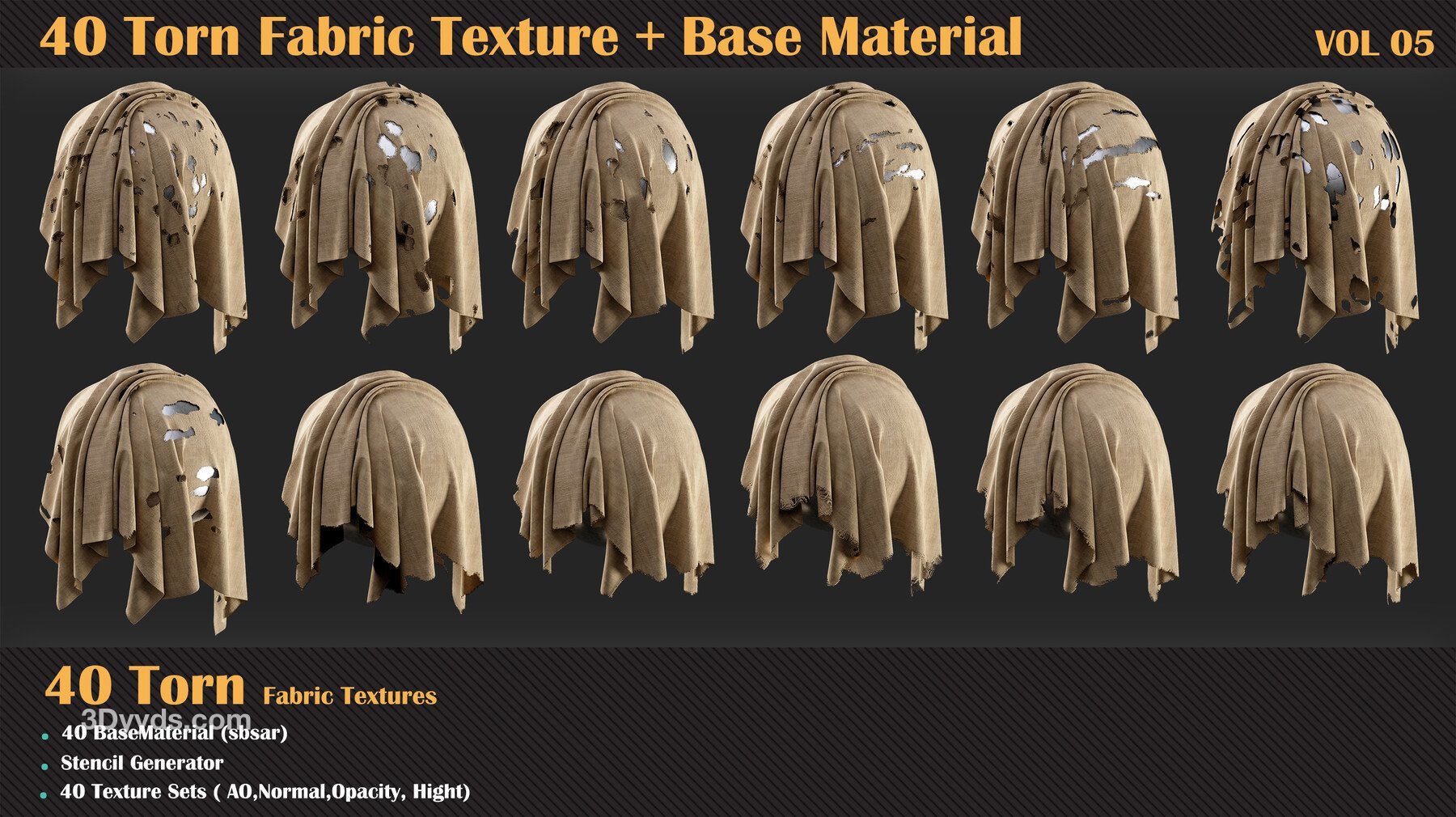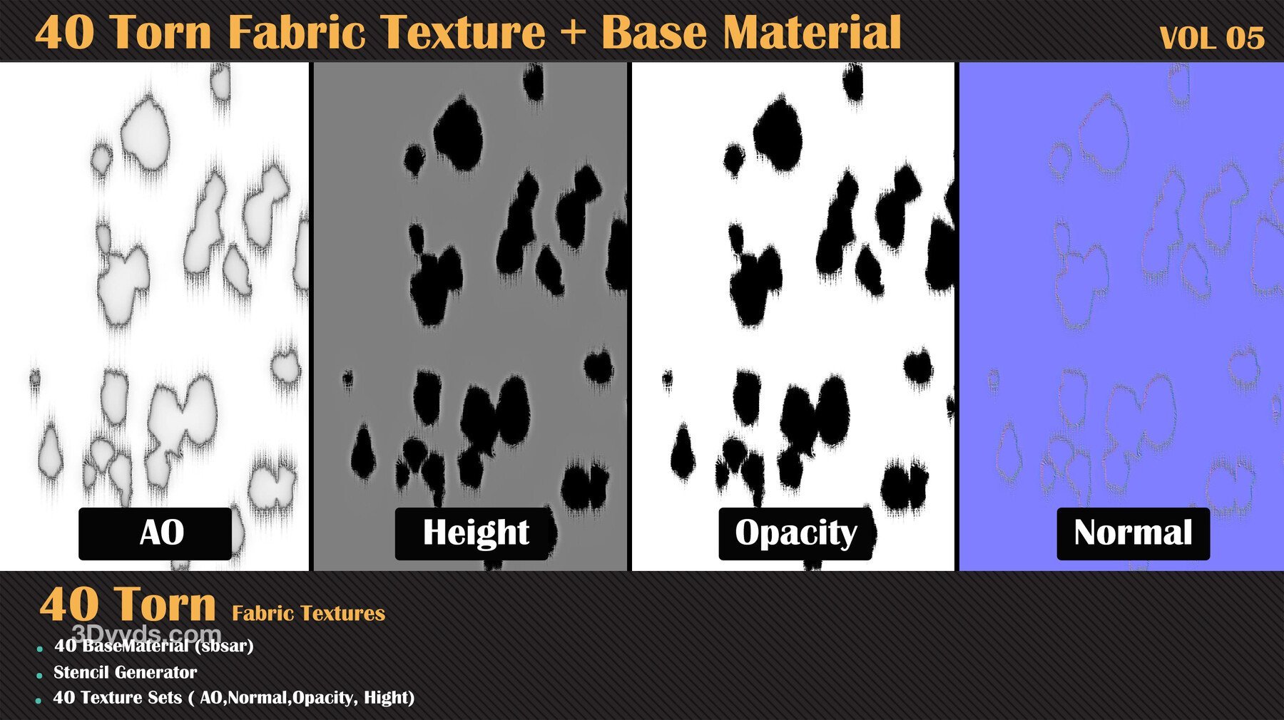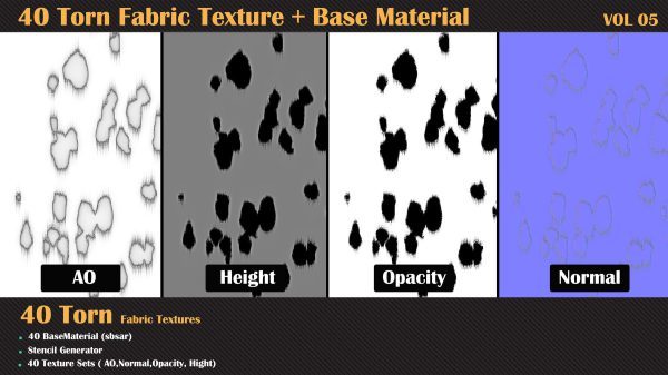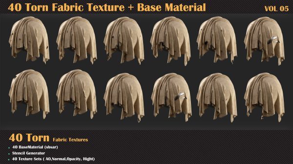 在这个产品中,我们为您提供了撕裂面料套装包,包括40种高质量的法线、高度、不透明度和环境光遮蔽贴图。另外,我们还提供了40种基础材料,以帮助您在项目中创建更具真实感的撕裂效果。在这个产品中,为了更轻松的工作流程,您可以通过模板生成器访问所有的撕裂不透明度贴图。因此,您可以在Substance Painter中轻松使用这些基础材料和模板生成器。这些材料具有基本参数。通过购买此套装,您可以毫不犹豫地在您的材料中使用这些无缝纹理,因为它们的质量不会阻碍您的进步。