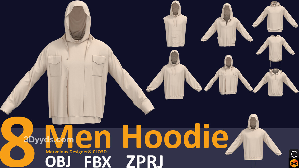 8款基本款男性连帽衫模型(VOL.02),这些模型是使用 CLO3D 6.2.234 版本设计的。