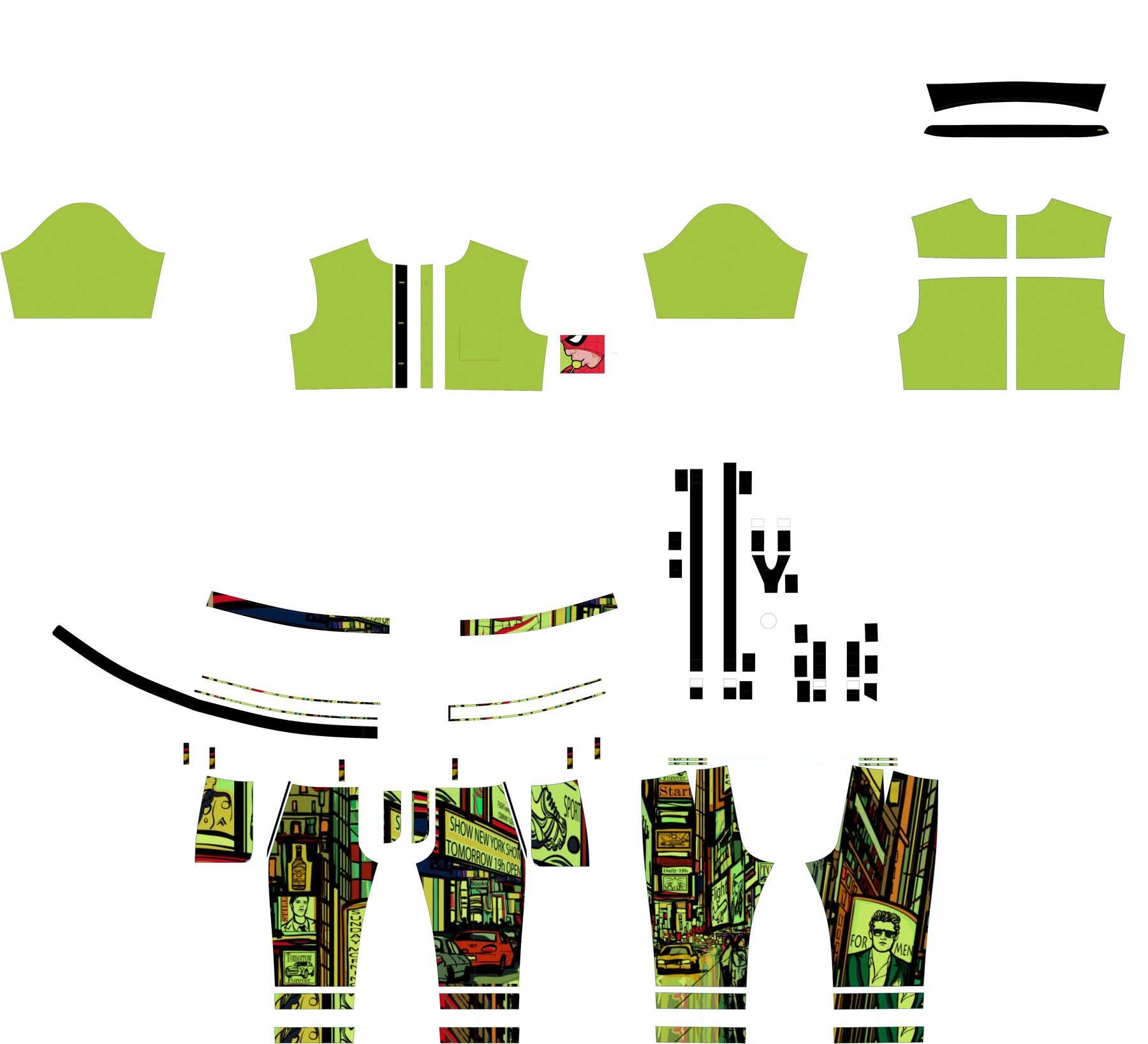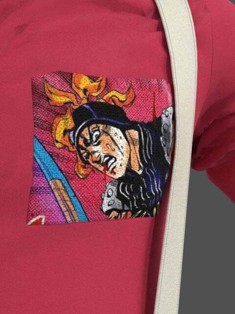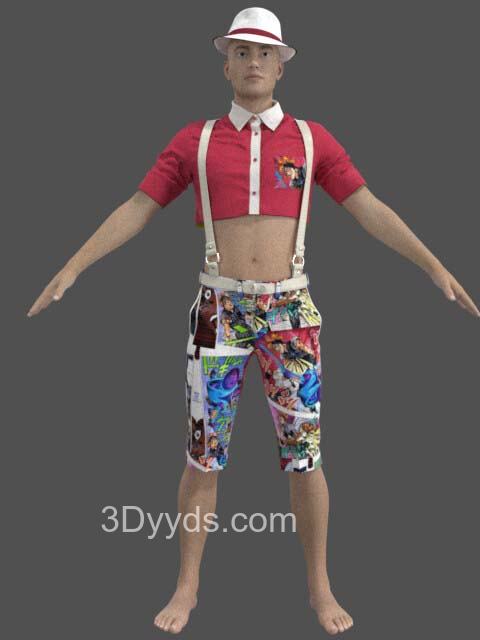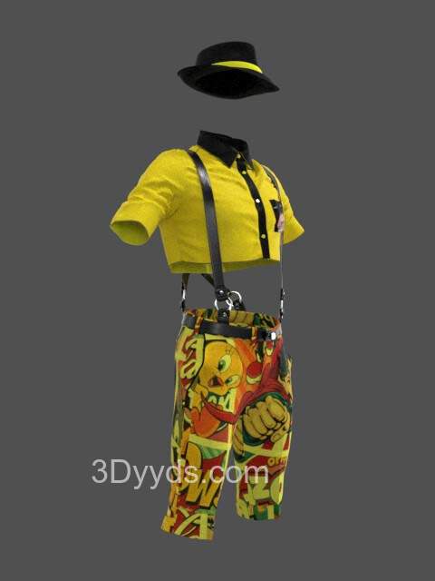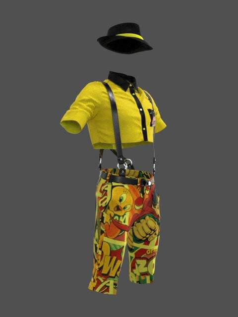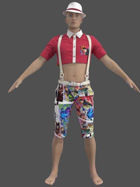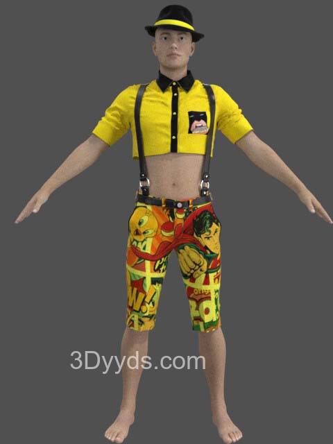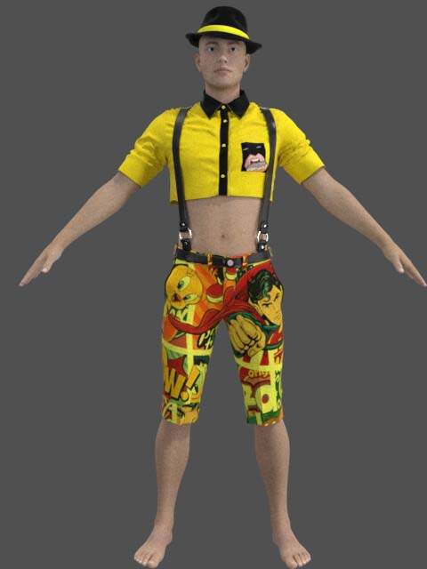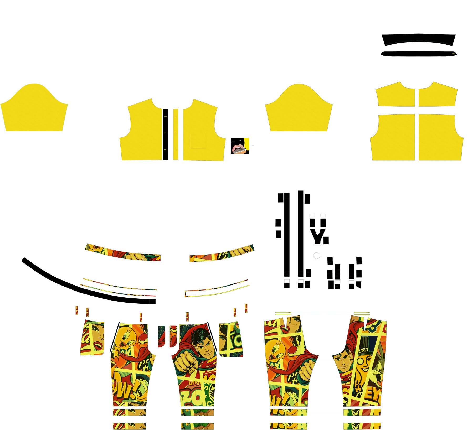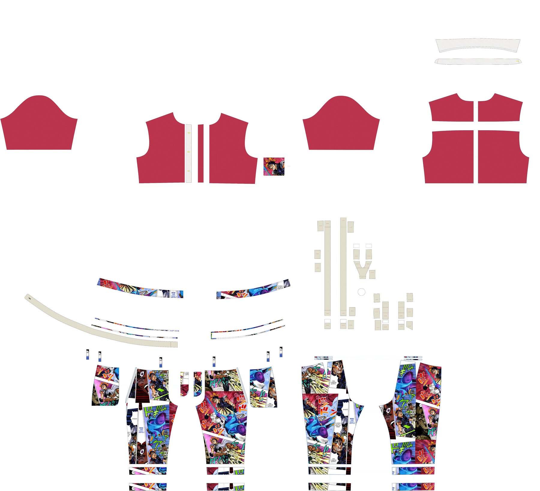 衬衫、裤子、帽子、腰带、腰带装饰、波普艺术、超级英雄、亮色。