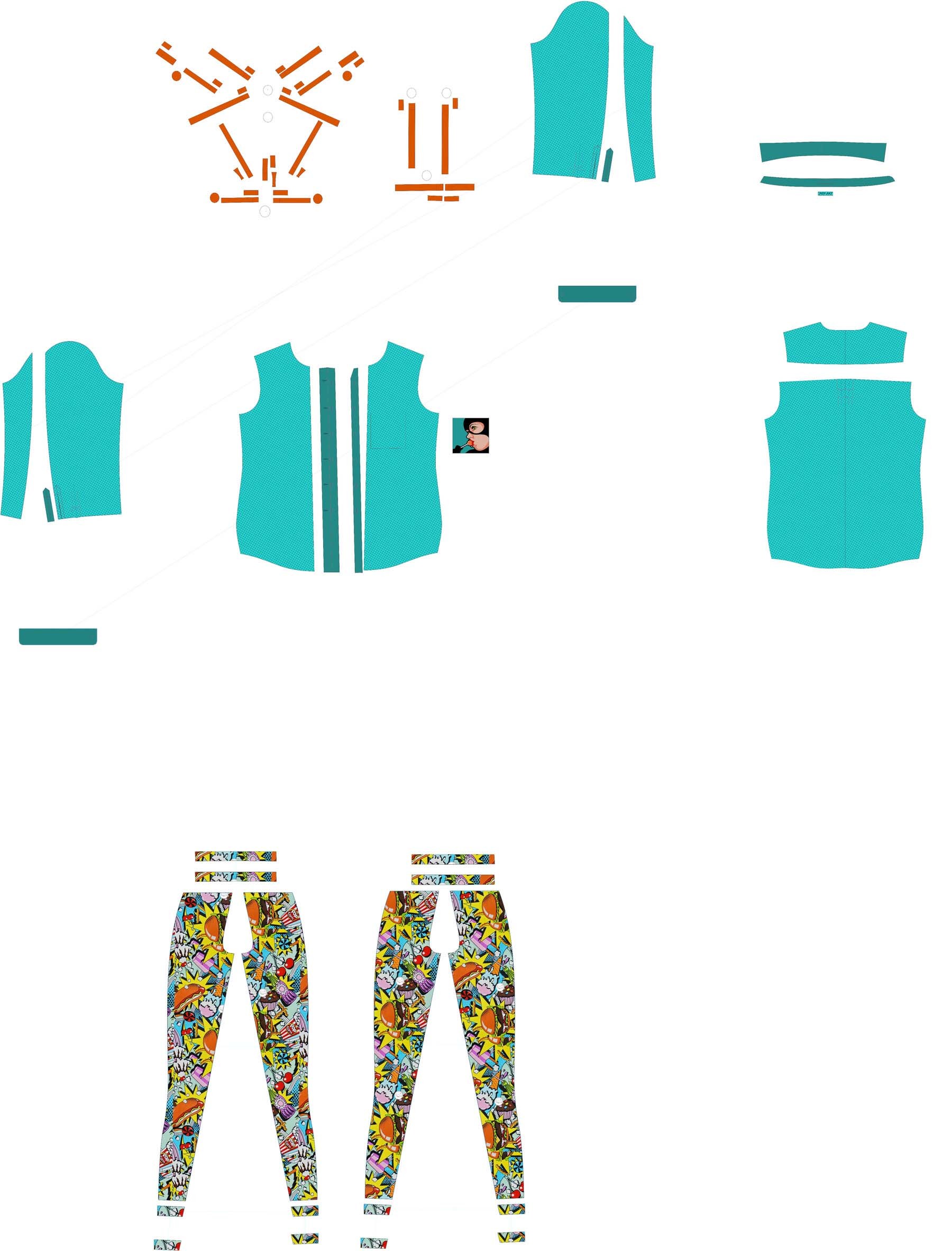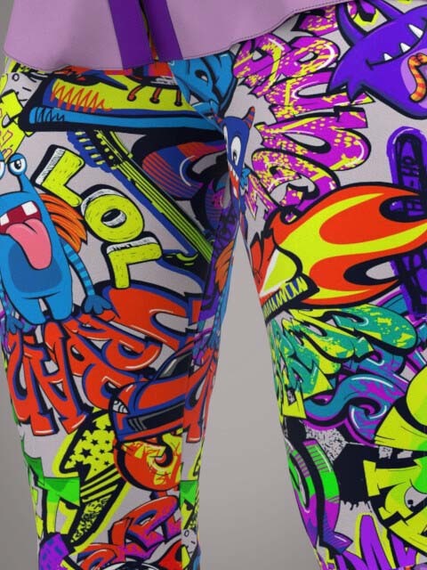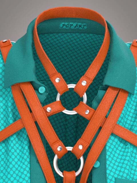 衬衫、裤子、腰带、腰带装饰、波普艺术、超级英雄、亮色。