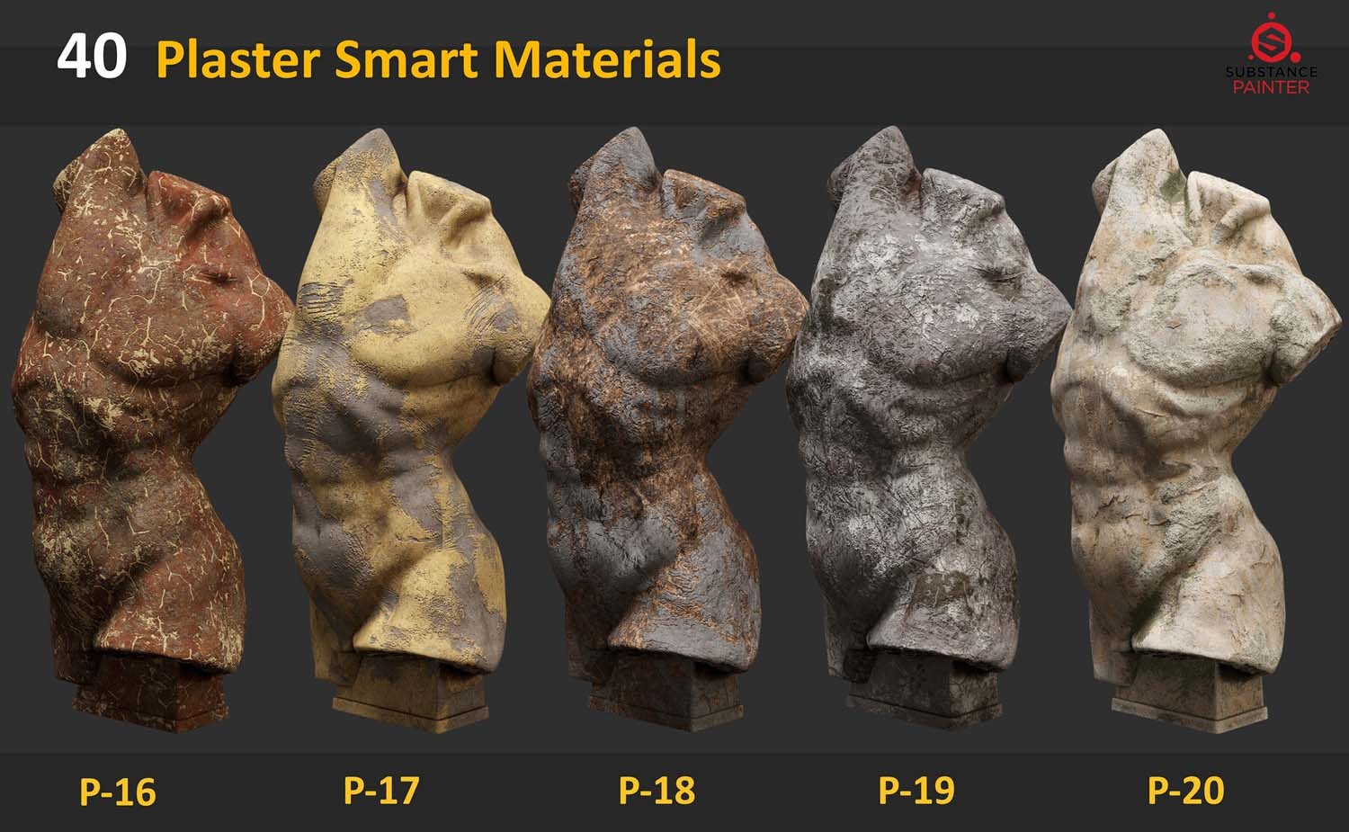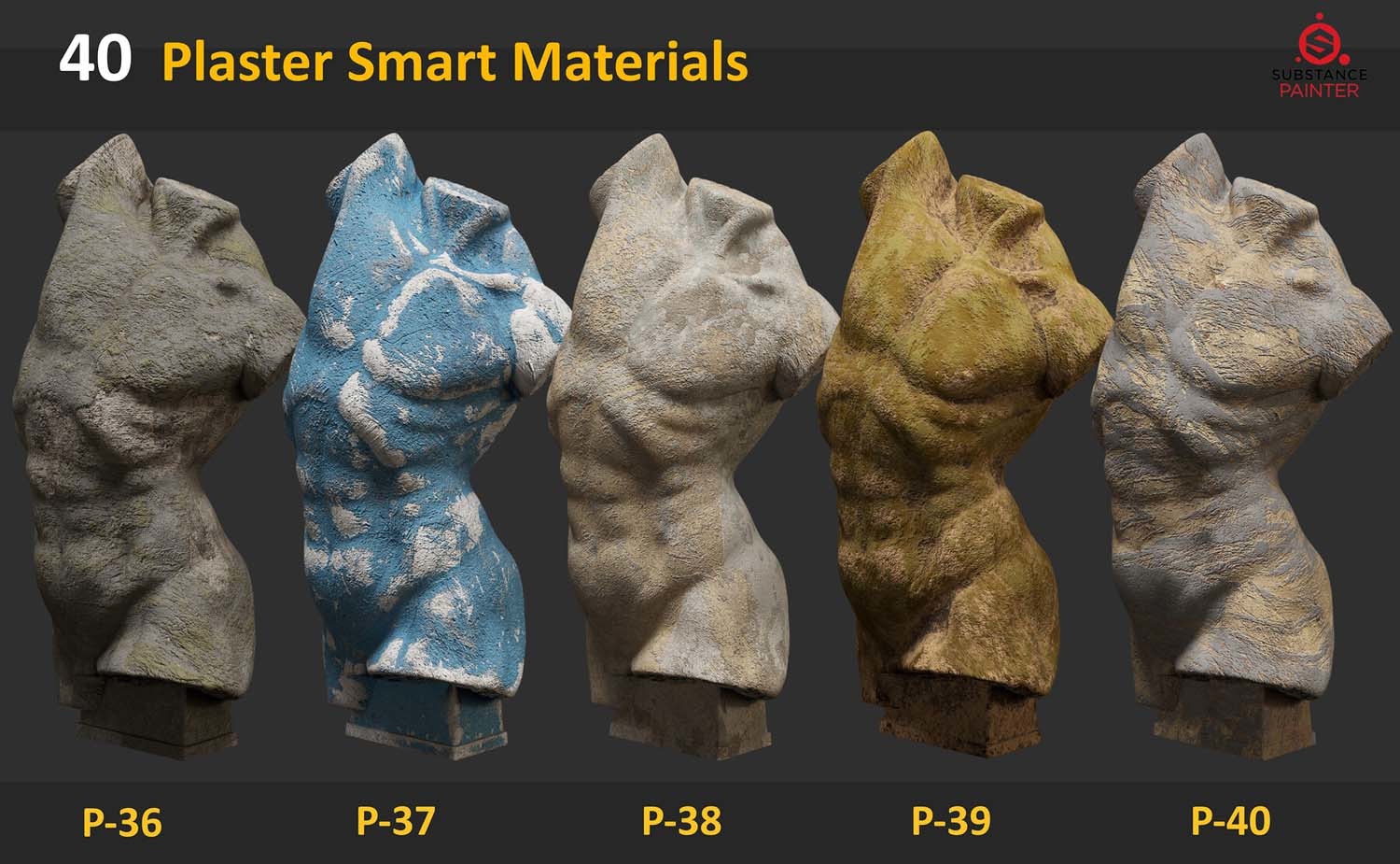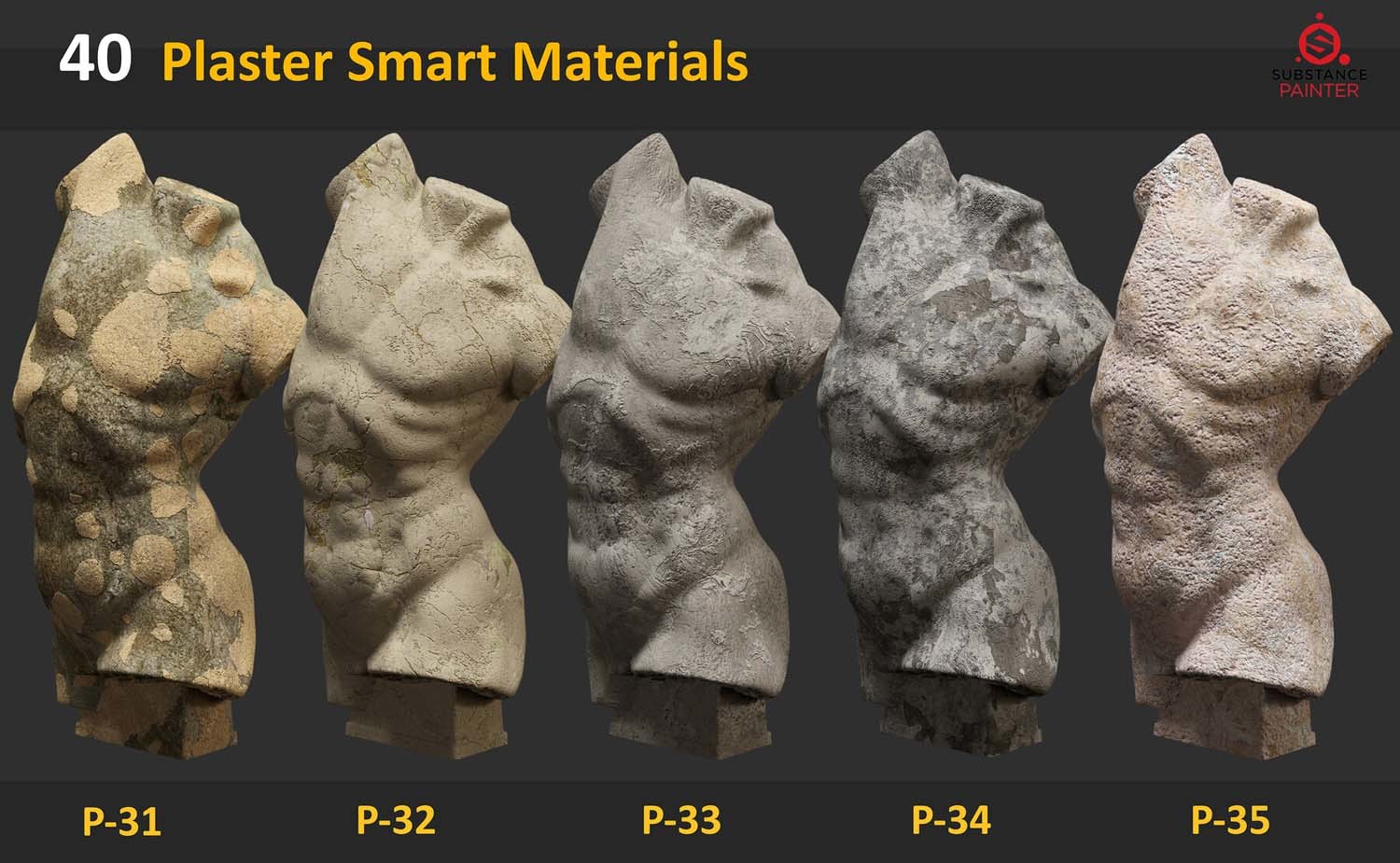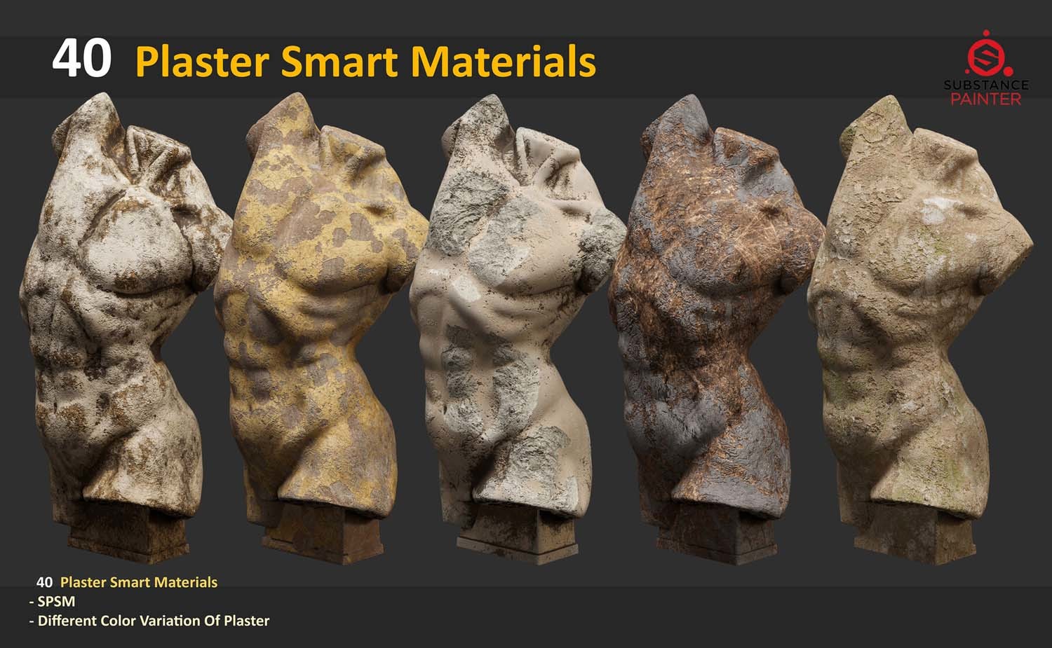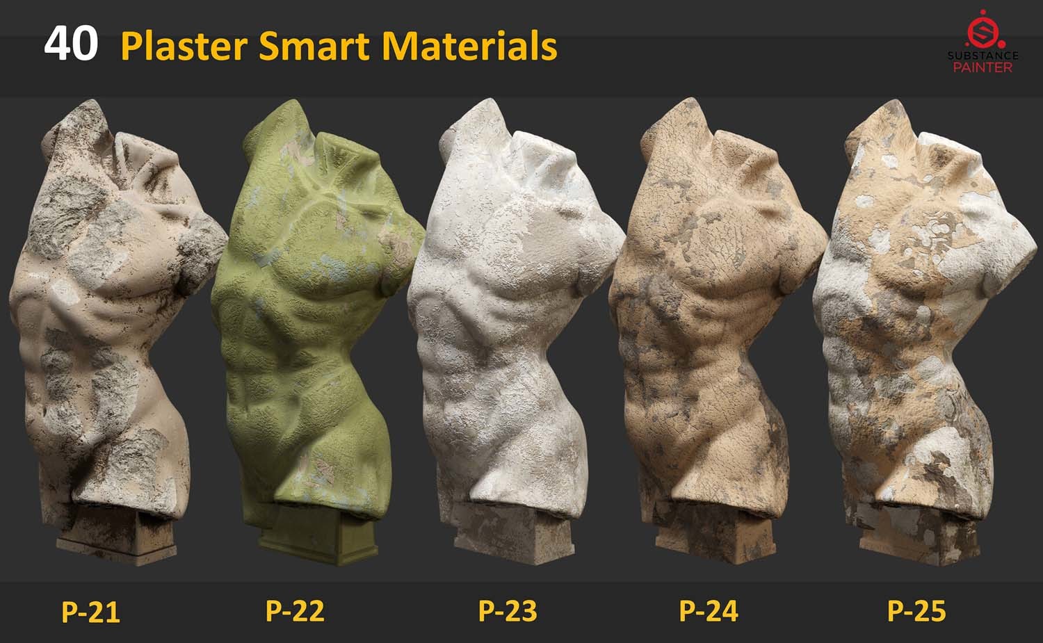此包包含 40 种适用于 Substance Painter 的石膏雕塑智能材料。