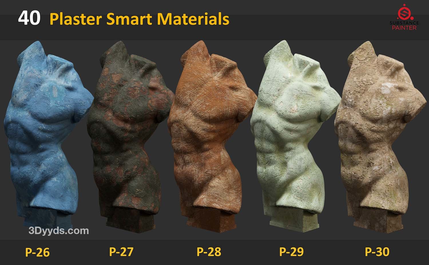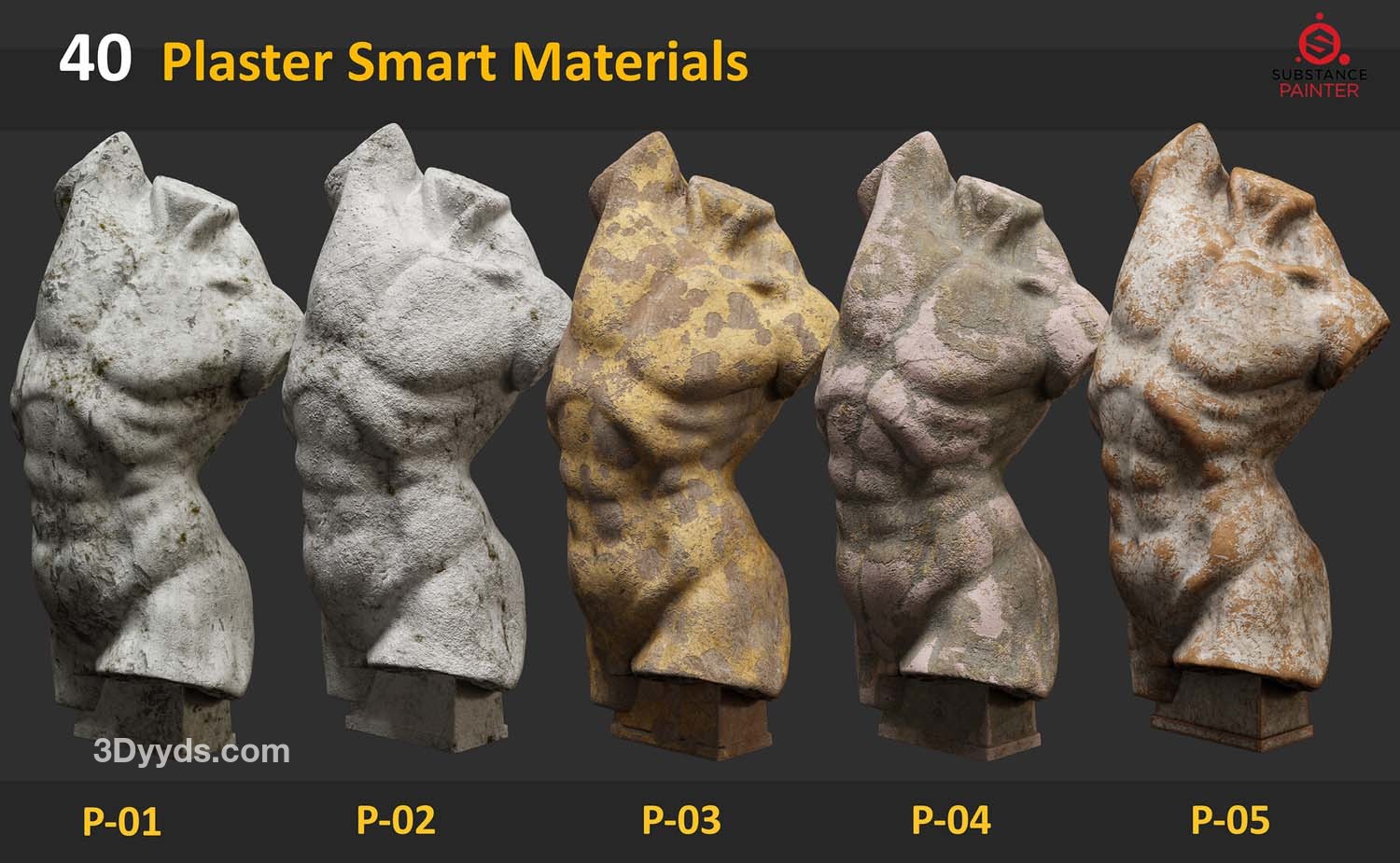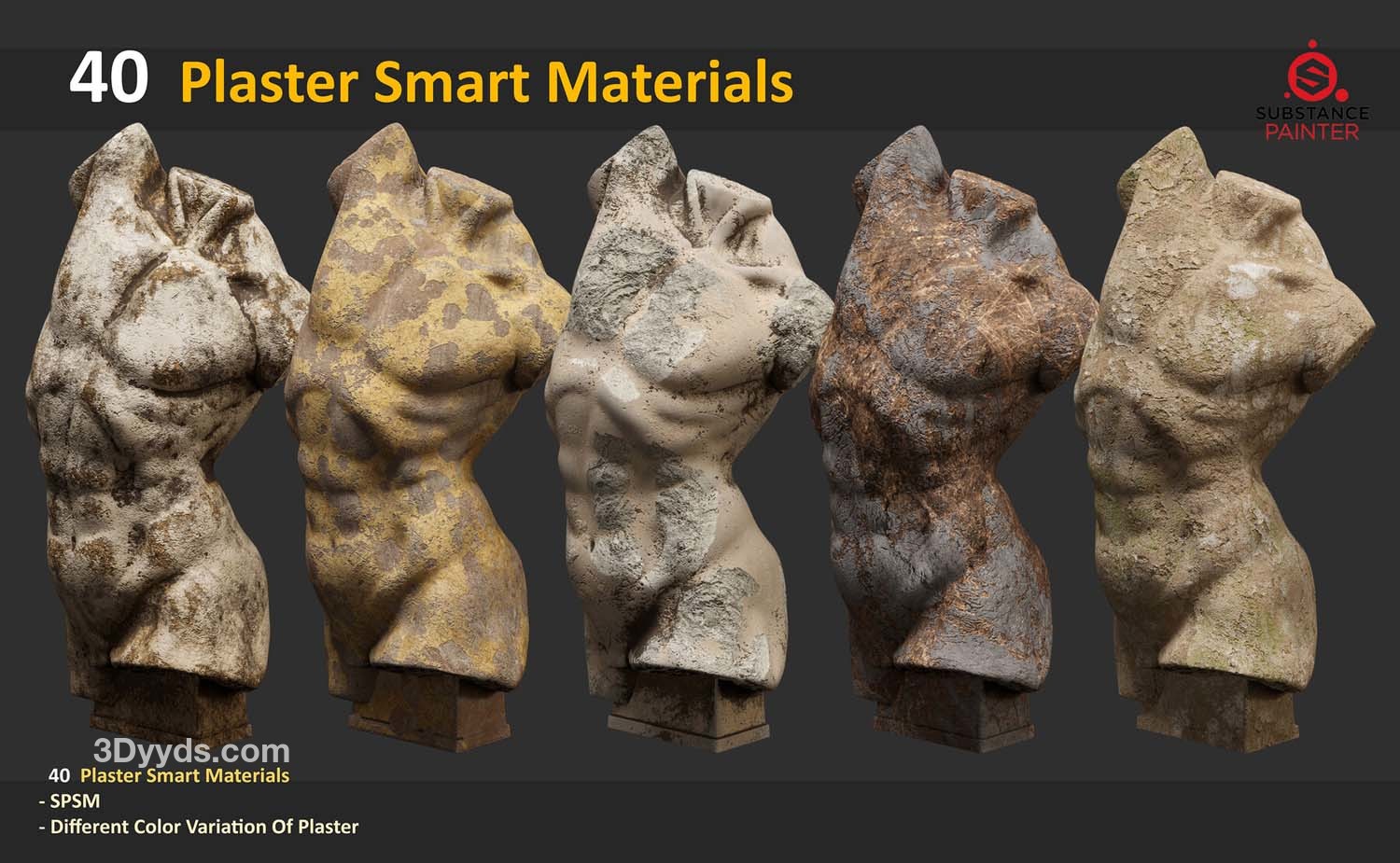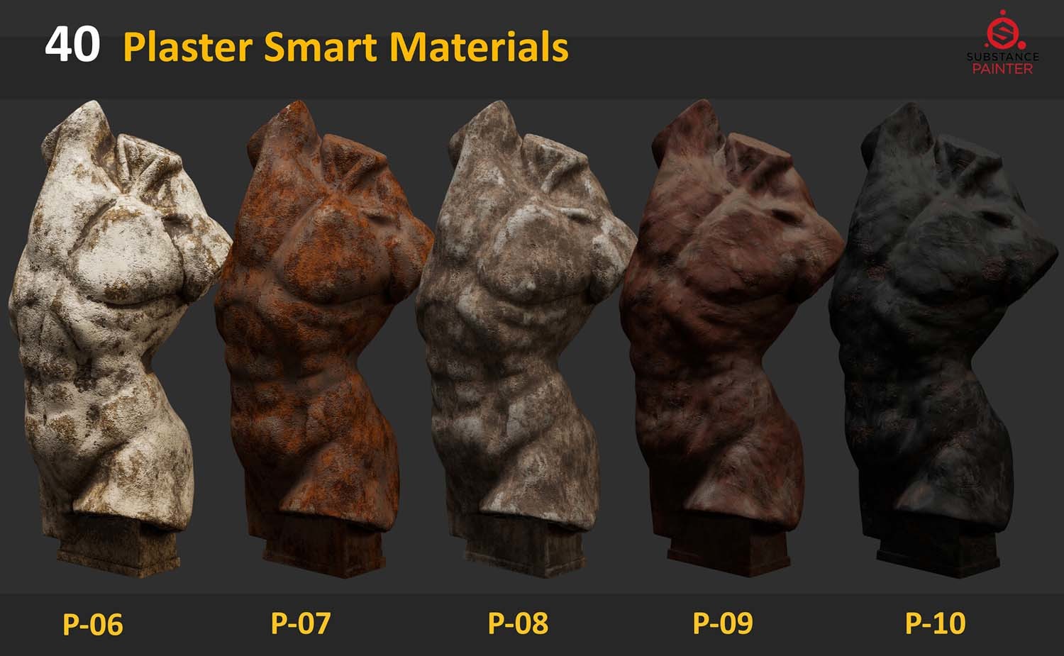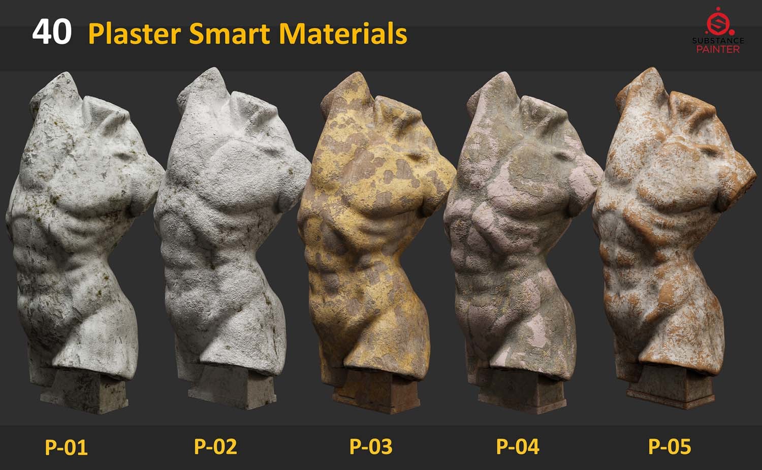 此包包含 40 种适用于 Substance Painter 的石膏雕塑智能材料。