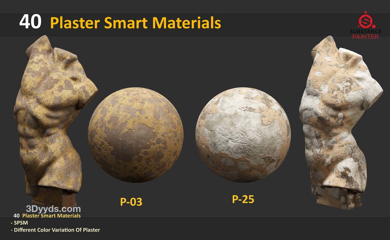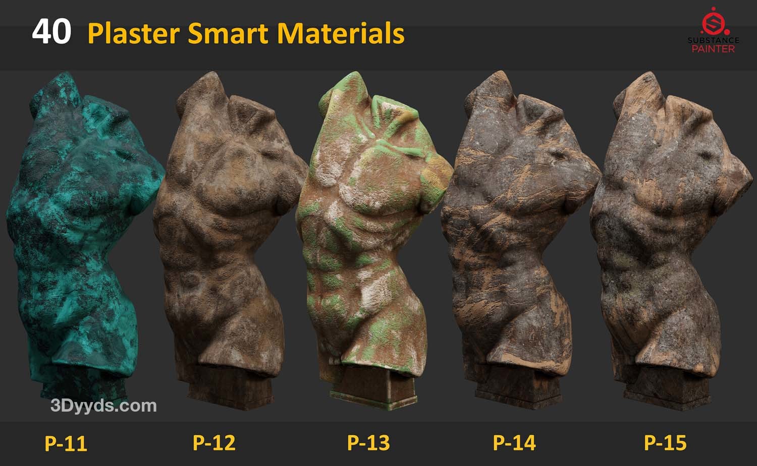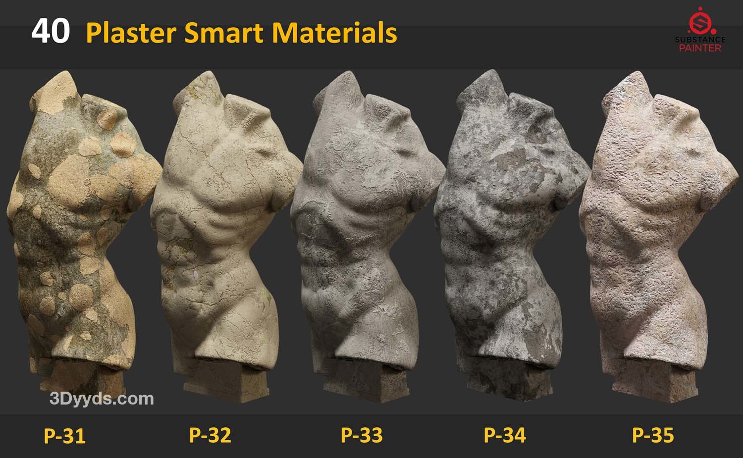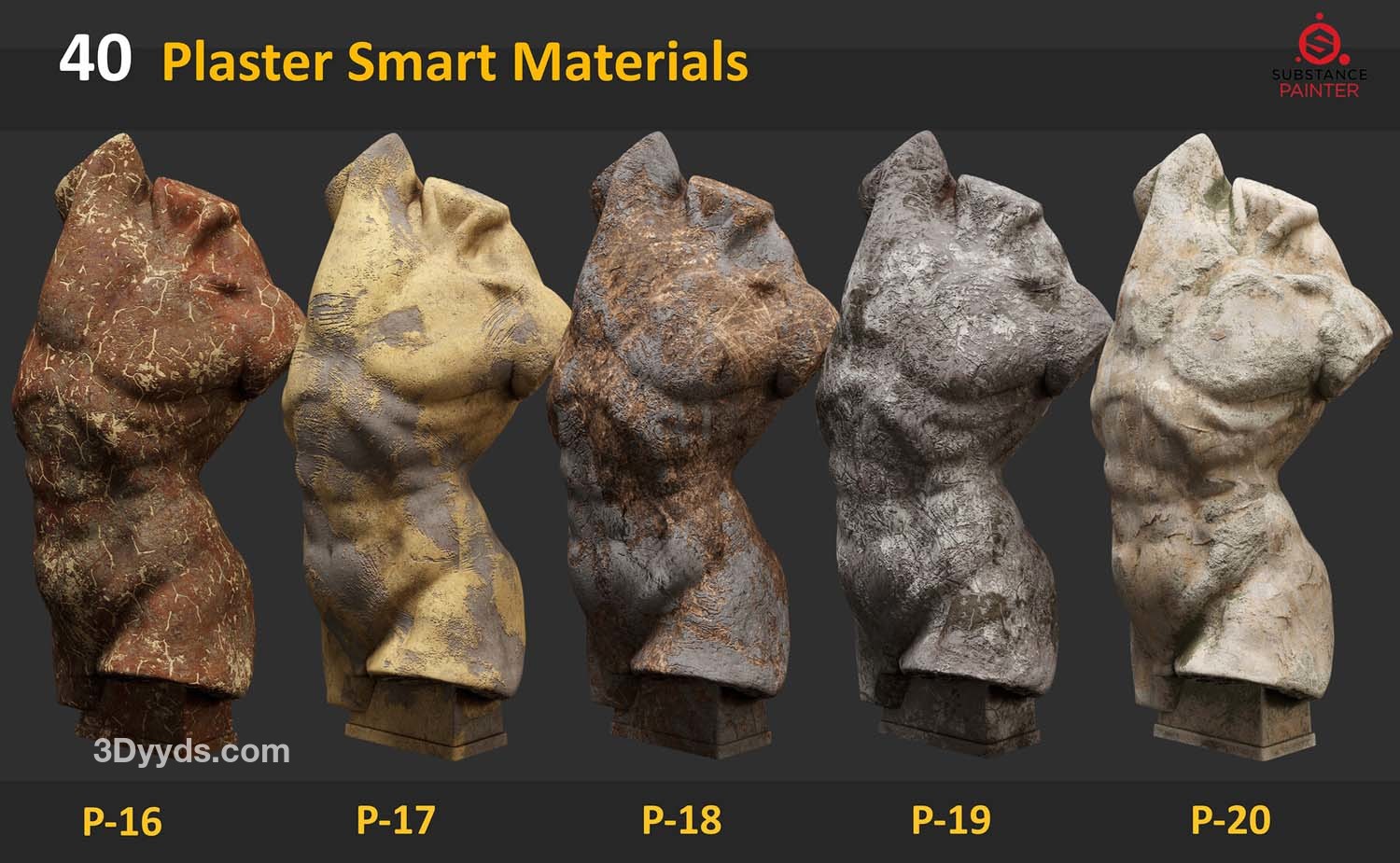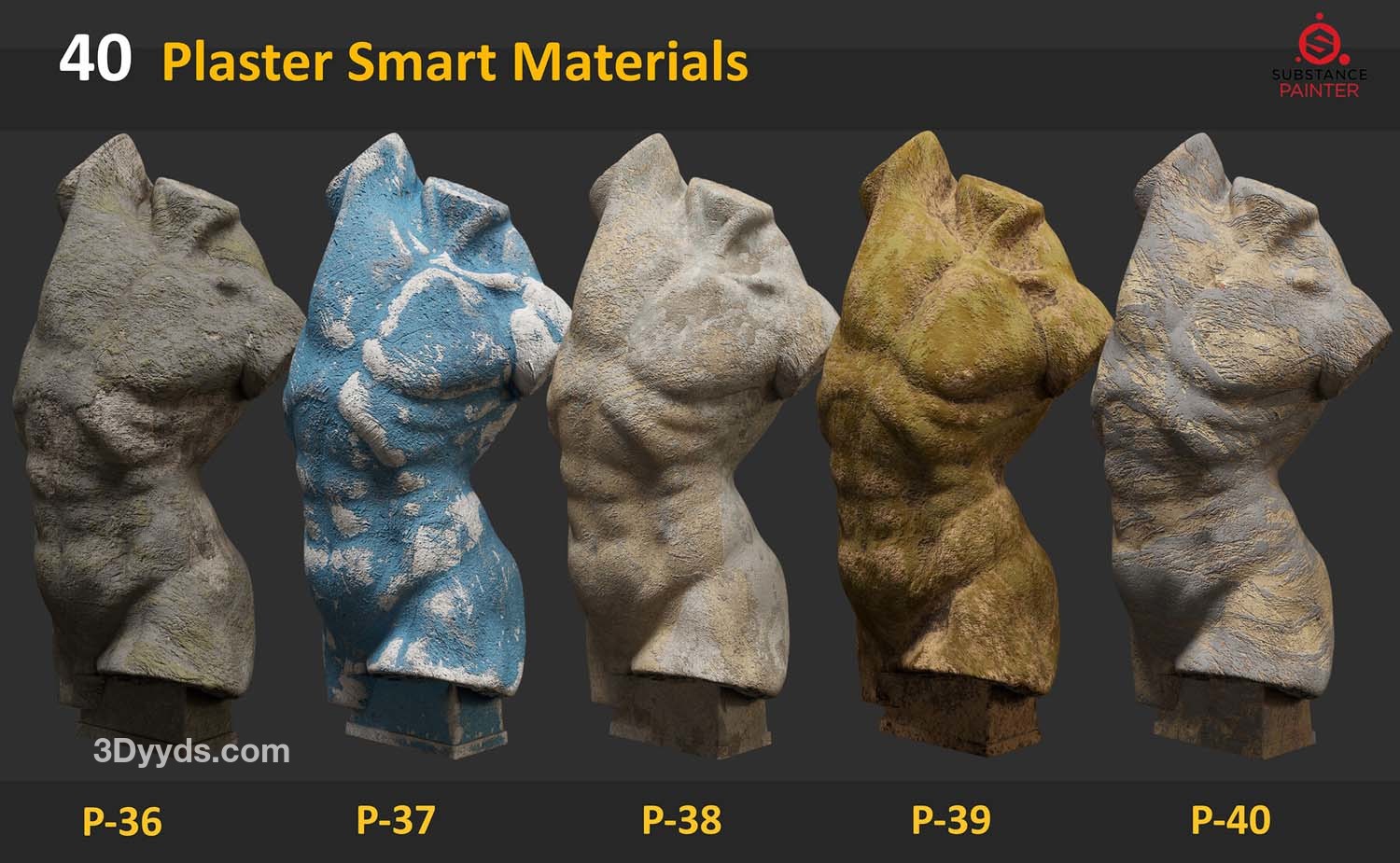 此包包含 40 种适用于 Substance Painter 的石膏雕塑智能材料。