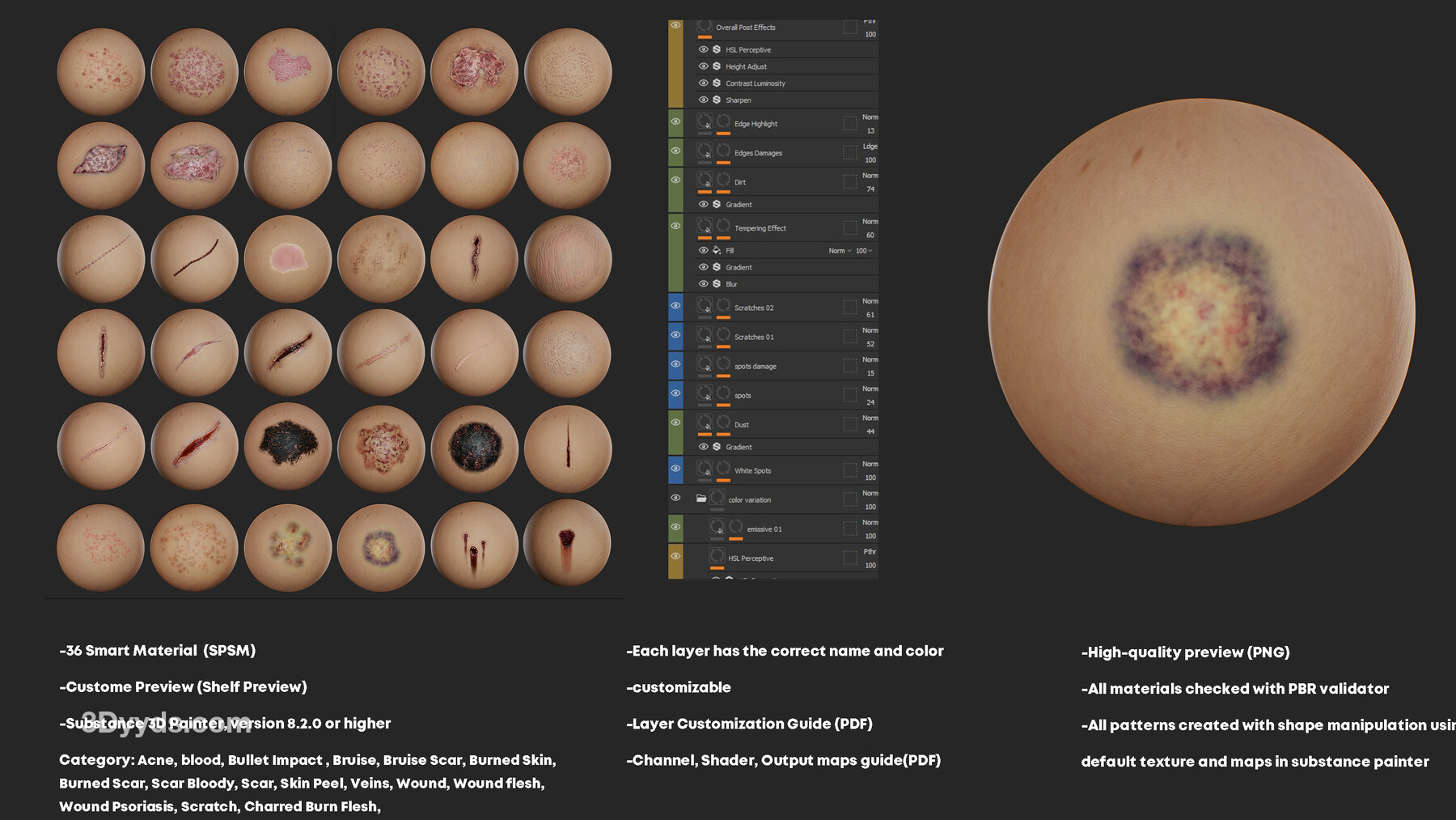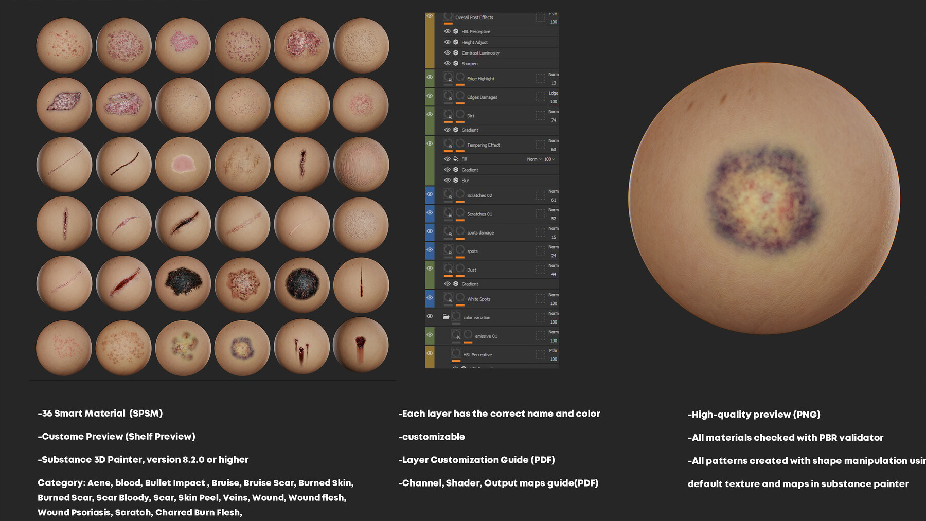 一包包含 36 个高细节且完全可自定义的角色皮肤智能材质,用于 Substance Painter(SPSM)。