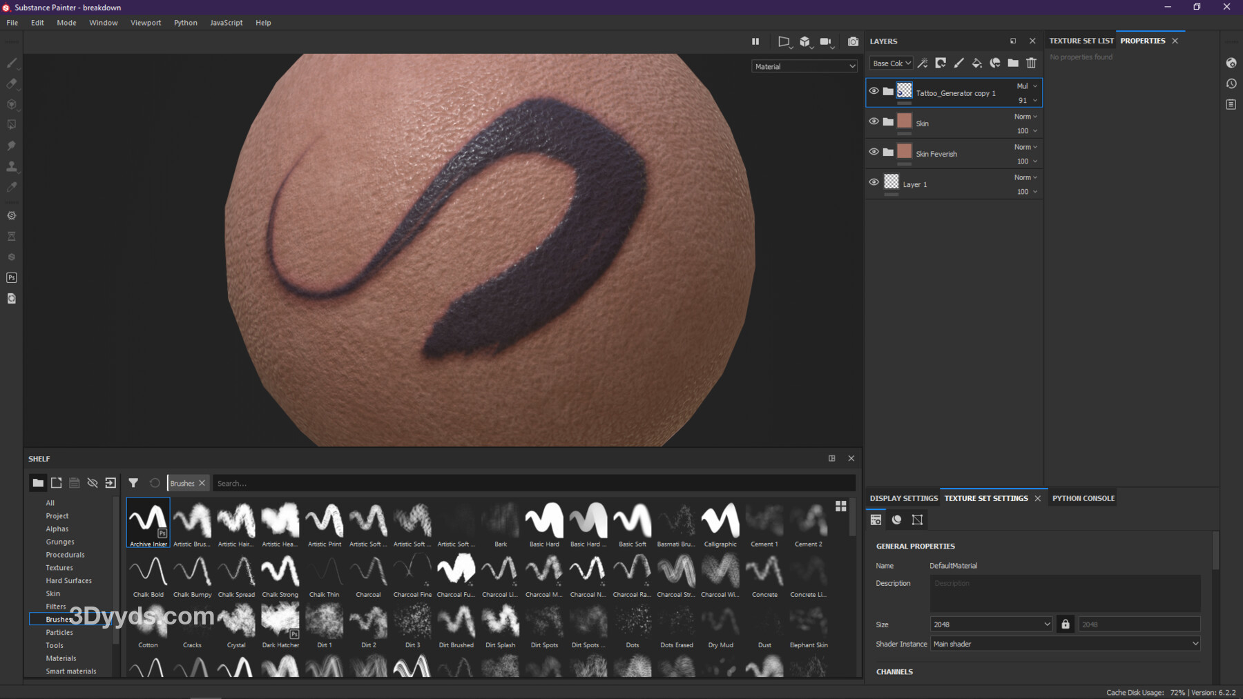 这是一个适用于 Substance Painter 的智能材质,具备创建精美纹身所需的参数,您可以通过绘制或使用现有纹理来创建纹身。